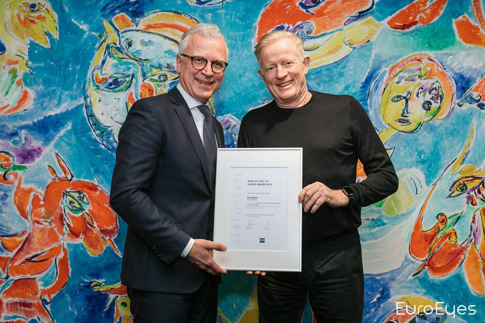 Dr. Michael Achtelik, Head of Global AccountsCarl Zeiss Meditec AG, überreicht Dr. Jørn Jørgensen das Zeiss Zertifikat für die Implantation der weltweit meisten Trifikallinsen 2019