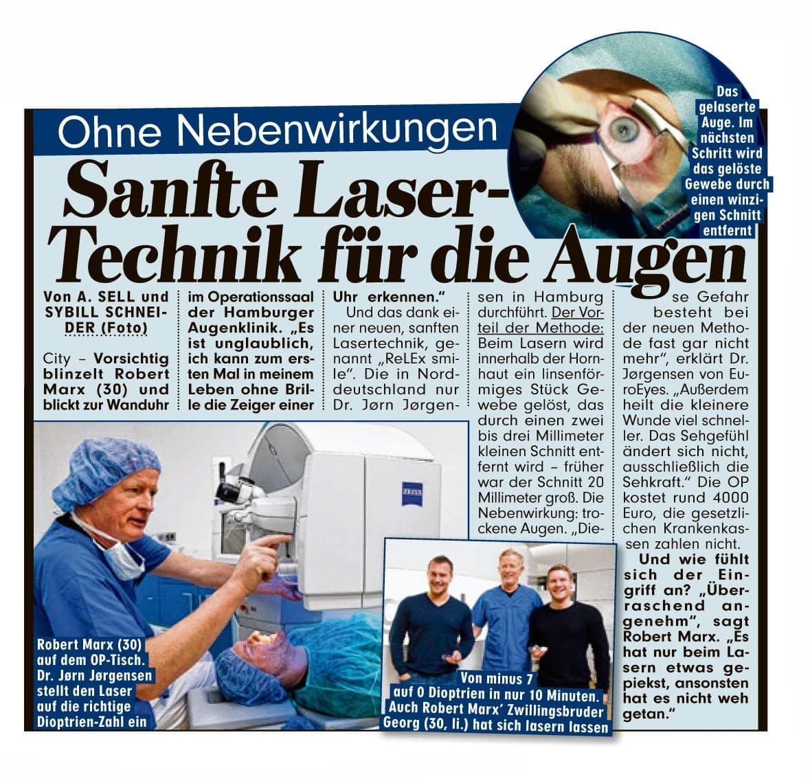 Die EuroEyes Klinikgruppe ist ein weltweit erfolgreiches Unternehmen, das vor mehr als 30 Jahren in Hamburg gegründet wurde und dort bis heute seinen Hauptsitz hat. EuroEyes ist weltweit an 40 Standorten vertreten – neben Kliniken in ganz Deutschland, auch in China, Dänemark, England und der Schweiz. Unser Unternehmen bietet Patienten das gesamte Spektrum der refraktiven Chirurgie zur Korrektur von Fehlsichtigkeiten an. Mit modernsten Augenlaser– und Linsenimplantationsverfahren behandelt EuroEyes jährlich über 35.000 Augen von Patienten mit Kurz- oder Weitsichtigkeiten, Hornhautverkrümmungen, Alterssichtigkeit oder Grauem Star.