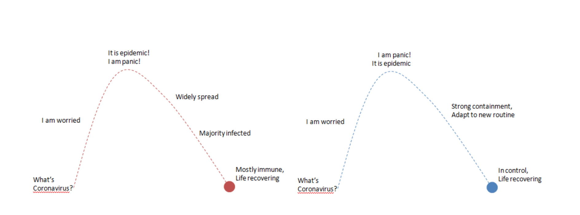 Es gibt keine einheitliche Strategie zur Bekämpfung von COVID-19. Verschiedene Nationen wählen unterschiedliche Strategien, von „aggressiver Eindämmung“ bis hin zur „Herdenimmunität“, die auf ihrem eigenen sozialen, wirtschaftlichen und kulturellen Hintergrund beruhen. Vor kurzer Zeit habe ich einen Bericht aus Europa über die Epidemie gelesen. Mu Ma Jun, die Autorin, zeichnete eine Abbildung (links) zur emotionalen Entwicklung der Durchschnittsmenschen in Deutschland, eine Illustration des kulturellen Unterschieds. Chinas emotionale Entwicklung (rechts) hingegen, von mir gezeichnet, sieht anders aus.