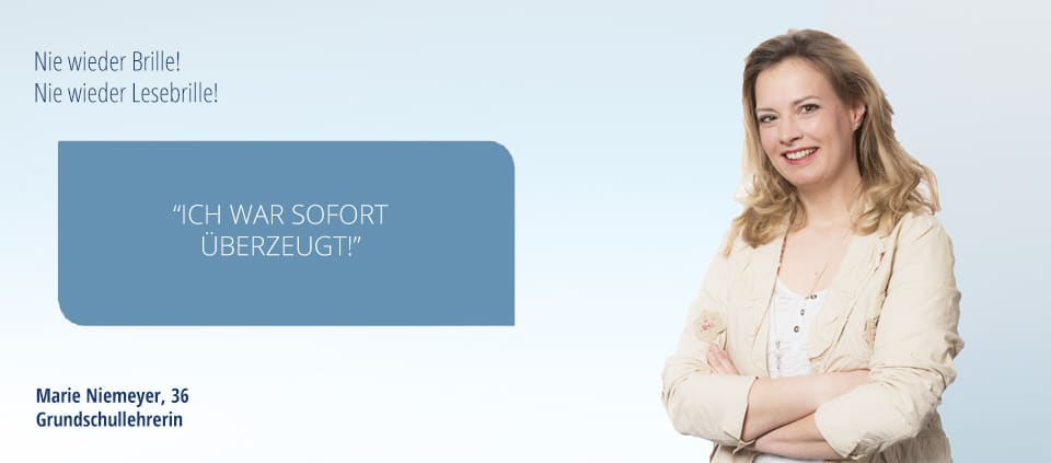 Marie Niemeyer ist Grundschullehrerin und von Geburt an sehr stark kurzsichtig. Seit ihrer Teenagerzeit trägt sie in der Öffentlichkeit ausschließlich Kontaktlinsen. Eine Brille zu tragen kam für Frau Niemeyer nicht in Frage, da selbst mit modernstem Glasschliff die Sicht nur unzureichend blieb. Jahrelang hat sich Marie Niemeyer mit ihren Kontaktlinsen gequält und zunehmend reagierten ihre Augen empfindlich. Abends waren sie oft gerötet und schmerzten. Besonders beim Reiten fühlte sich Marie Niemeyer mehr und mehr eingeschränkt, da durch Staub und Pferdehaar die Kontaktlinsen noch unverträglicher wurden.