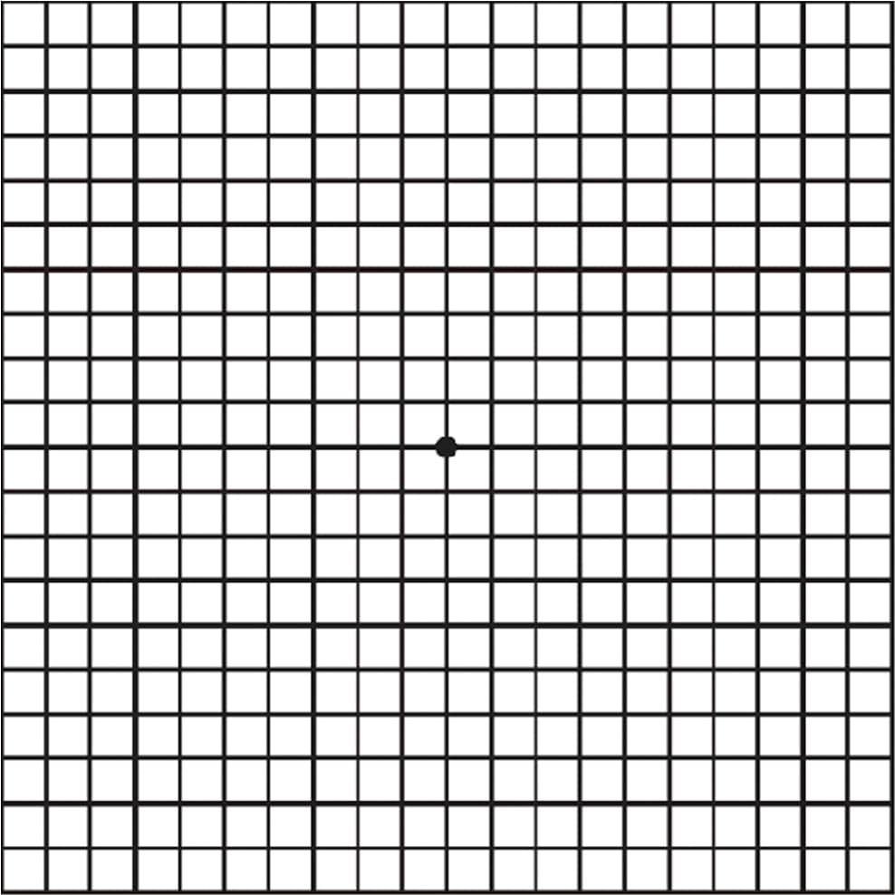 Der Amsler-Gittertest ist eine einfache Möglichkeit, eine Makulaerkrankungen im Frühstadium zu erkennen. Eine Person mit normalem, gesundem Sehvermögen wird alle geraden Linien sehen. Eine Person mit AMD sieht Linien wellig und verzerrt. Sollten sie Verzerrungen, dunkle oder verschwommene Stellen, unterschiedlich große Kästchen oder verbogene oder verzerrte Linien sehen, dann kontaktieren Sie uns.